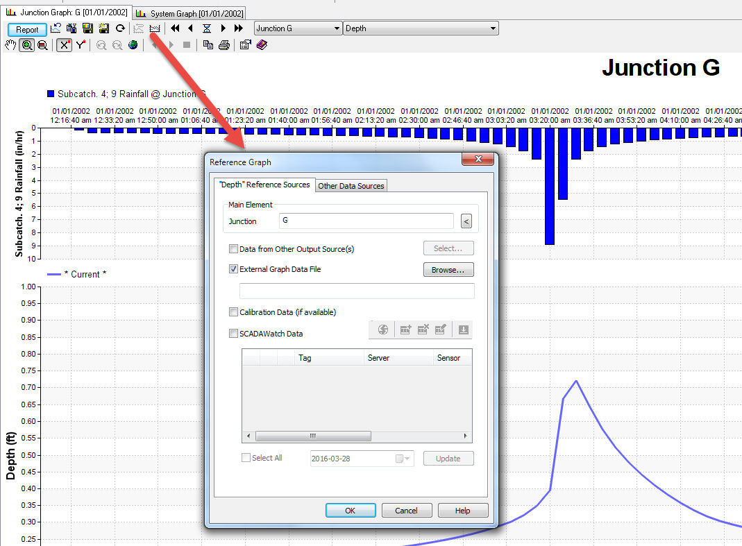 | Figure B. Calibration data and Flows or Node depth are compared directly in the Output Manager of InfoSWMM. |