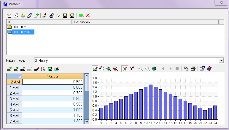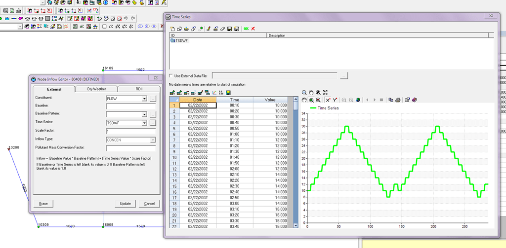 Here is an example of how this is used. The base DWF pattern is over a 24 hour period (Figure 1). The two day result is copied from the InfoSWMM report manager and applied as a multiple day pattern in the time series editor (Figure 2). The Scenario Manager of InfoSWMM allows two runs: (1) DWF Pattern only and (2) DWF Pattern + Time Series for Two Days (Figure 3). The Output Report Manager of InfoSWMM shows that the Inflow Time Series + DWF is twice the DWF only (Figure 4). It shows that the the multiple day pattern is the same as the DWF pattern for two days.