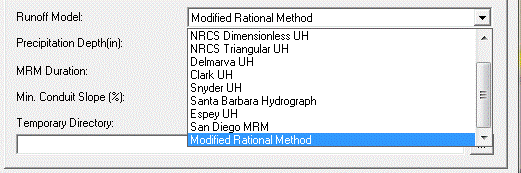 Figure 2 Modified Rational Method is the last method in the Pull Down Menu in the Runoff Model Selection Dialog.
