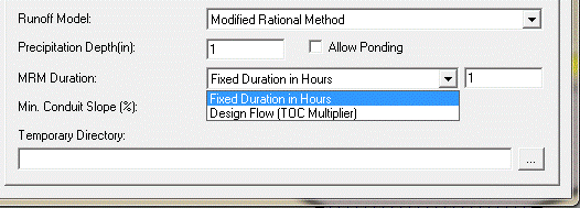 Figure 6 The duration of the Modified Rational Method (MRM) is either entered as absolute hours or a time of concentration (Tc) multiplier