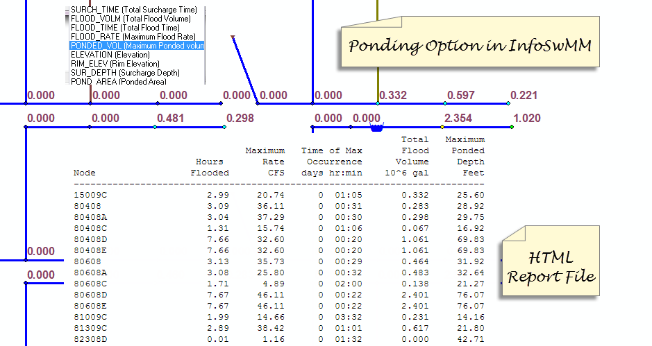 Figure 4. The Map Display of the Node Flooding using the Surface Ponding Option should use the Map Display Variable PONDED_VOL which shows the Maximum Stored Pond Volume.