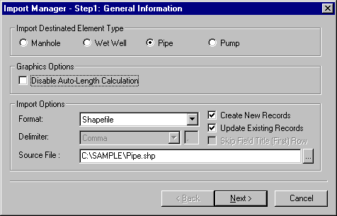 The first step of an import is to identify which InfoSewerH20Map Sewer element and import options are desired.
