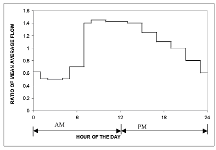 For an extended period simulation, no peaking formula is used, instead, the multiplication factors from the diurnal pattern are used to adjust (multiply) all types of loads before they are aggregated. An example peaking-factor curve is shown below.