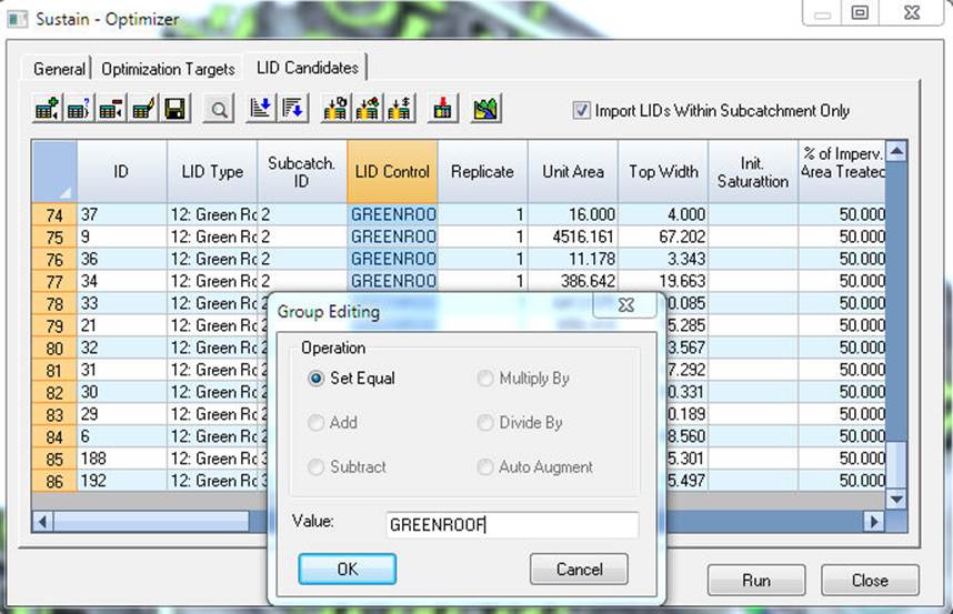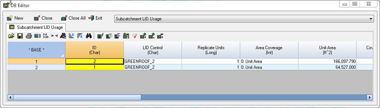 Use the BlockEdit Tool or Icon to set the LID Control for all of the other Rows with an LID Type of Green Roof.
