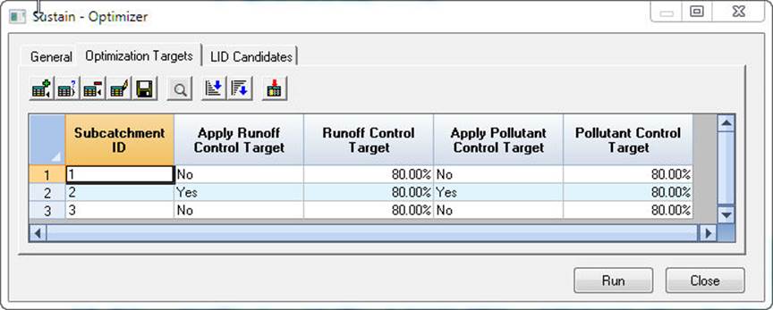 We will use the preset targets of 80 percent for Runoff and Water Quality for all of the Subcatchments.