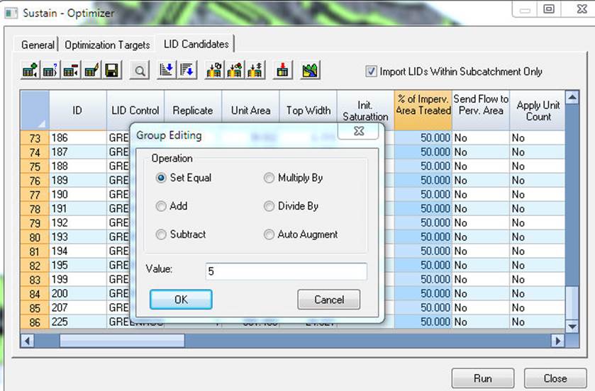 An important rule is that the total area treated by all LID Types for a particular Subcatchment does not exceed 100 percent of the impervious area. Use the BlockEdit tool again and set the Percent Imperviousness Area Treated to 5 percent per LID Type.