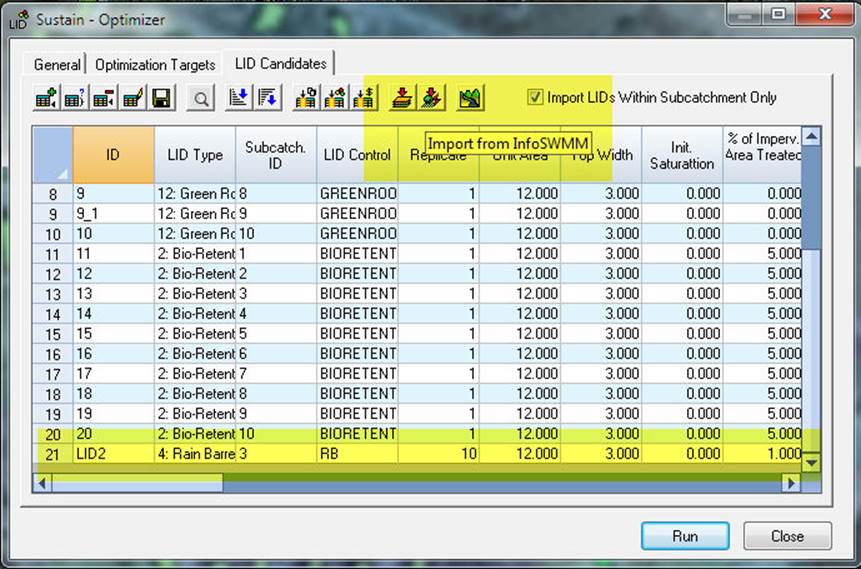 In addition to the LID Candidates found by the Siting Manager or added by the Sustain User directly to the LID Candidates Grid you can also import any LID's defined in the LID Usage DB Table. Three ways to import or create the LID Candidate Rows.