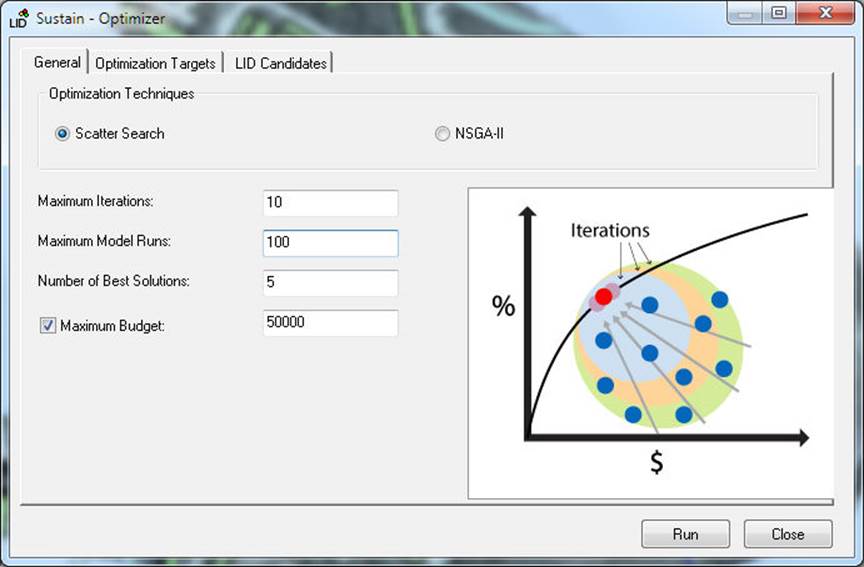 This example shows the importance of a treatment train, the percent imperious draining to the LID's on a Subcatchment, the importance of optimizing for the number of units, area and soil thickness. Sustain will optimize the number of Rain Barrels on the ten Subcatchments.