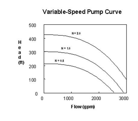 By definition, the original pump curve supplied to the program has a relative speed setting of 1. If the pump speed doubles, then the relative setting would be 2; if run at half speed, the relative setting is 0.5 and so on. The figure below illustrates how changing a pump's speed setting affects its characteristic curve.