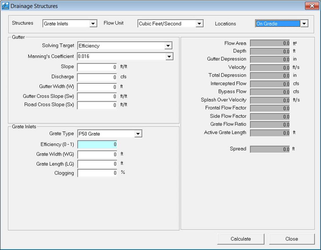 · Efficiency –Interception efficiency of the grate. It represents ratio of intercepted flow to total gutter flow.