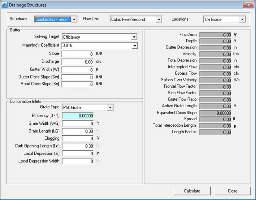 The dialog box for combination inlet on grade is shown below. For methodology click here.