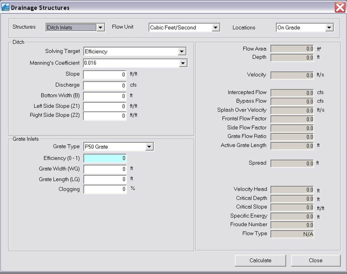 The dialog box for ditch inlets on grade is shown below. For methodology click here.