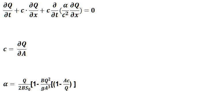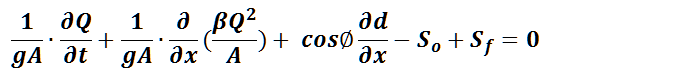 The Saint-Venant equations or full dynamic wave equations for open channel flow routing consist of the conservation of momentum equation and the equation of continuity. The momentum equation is:
