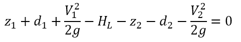 Here z denotes the invert elevation; d represents the water depth; and HL designates the head loss between sections 1 and 2. The energy equation is used to determine the difference in hydraulic grade line elevation (which is added at the upstream manholes) needed to pass downstream flows under the surcharge condition.