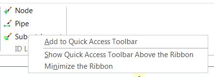 InfoSWMM SA has a powerful Quick Access Toolbar for most file and general commands. You can show the menu above or below the InfoSWMM SA ribbon. Additionally, you can add any command to the Quick Access Toolbar by right mouse clicking on a command and adding the feature to the Quick Access Toolbar.