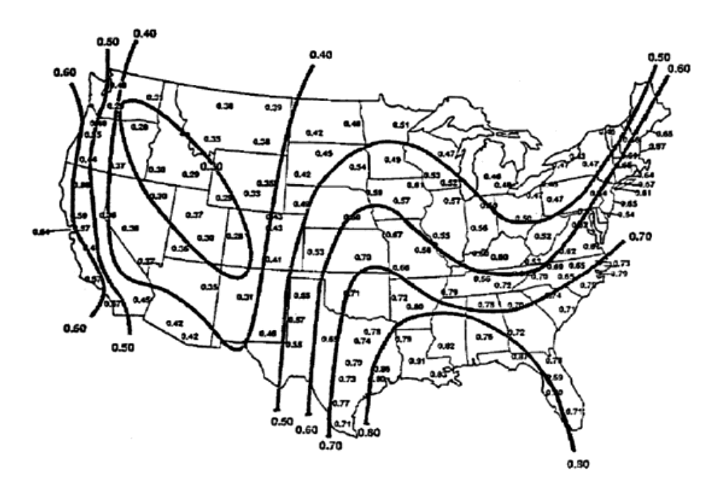 Figure 3-4. Average depth (inches) of runoff producing storms in the US (Driscoll, et al., 1989)