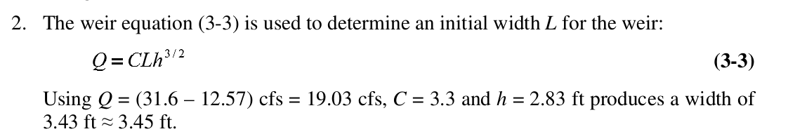 The model can now be run with the 100-yr storm using the combined WQCV, 2yr and 10-yr orifices to determine if the 100-yr weir is needed. The peak discharge of these combined orifices for the 100-yr storm is 12.57 cfs, which is not enough to pass the 100-yr storm’s runoff (31.6 cfs), and the storage unit floods. A weir will be designed to control this extreme event so that the pre-development discharge is matched and the total water depth in the pond does not exceed the 6 ft depth that was given as the maximum depth for safety reasons. This is accomplished as follows: