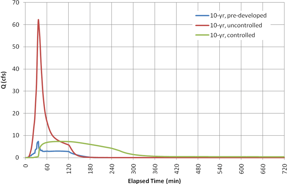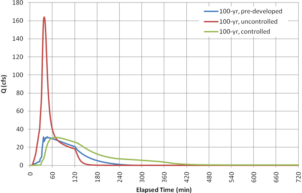 The outflow hydrographs produced by this final design for the detention pond were compared against those resulting with no control as well as against the pre-development discharge targets. Those target discharges were 4.14, 7.34 and 31.6 cfs for the 2-, 10- and 100-yr storms, respectively. The post-development controlled hydrographs were generated using the scenario for the final design of this example (EX3), while the post-development uncontrolled discharges were generated using the final design scenario developed in Example 2 (EX2-POST). The pre-development hydrographs were generated using the final design scenario developed in Example 1 for the pre-development watershed (EX1-PRE). The models were run using a 15 second time step for reporting, wet-weather runoff and flow routing and a 1 hr dry weather runoff time step.