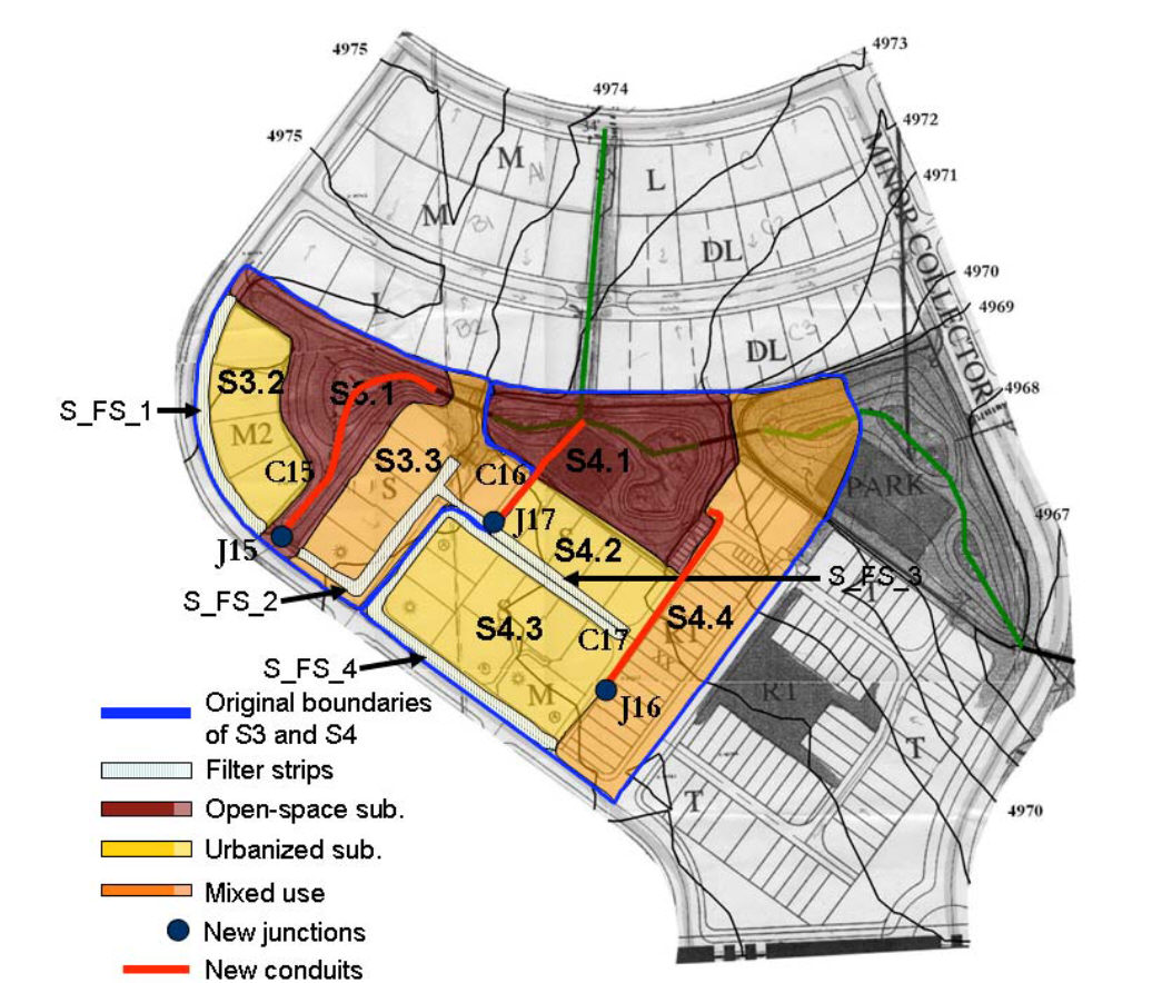 The two LIDs modeled here are filter strips and infiltration trenches. Guidance in the representation of these and other LIDs can be found in Huber at al. (2006).