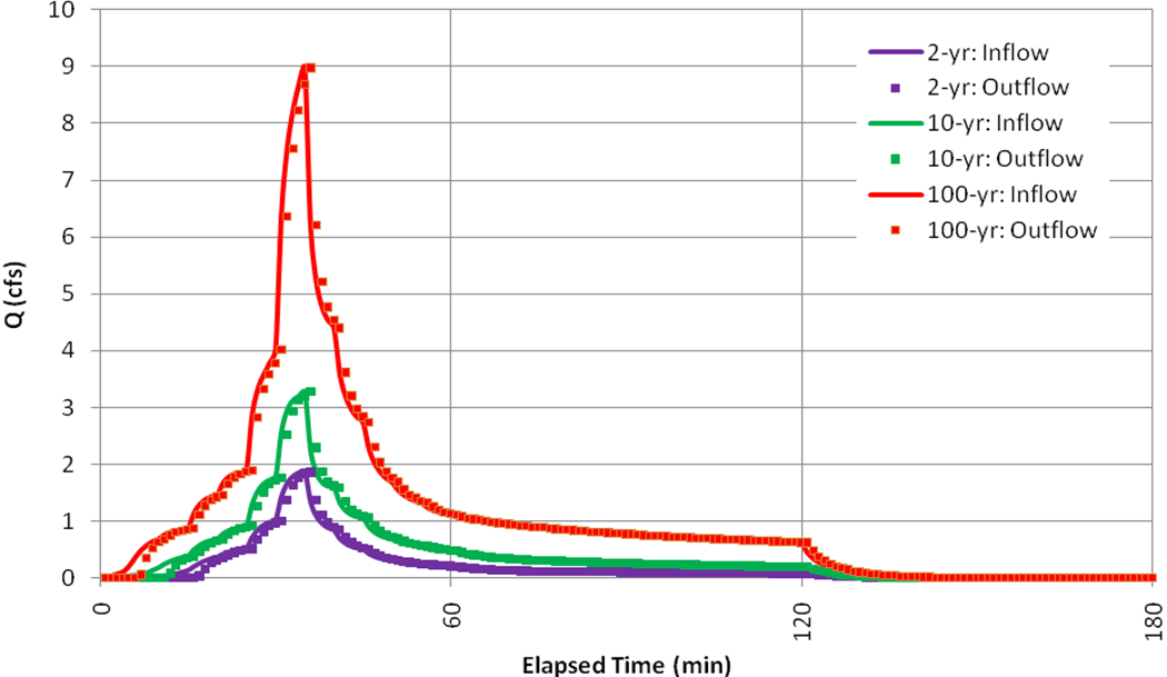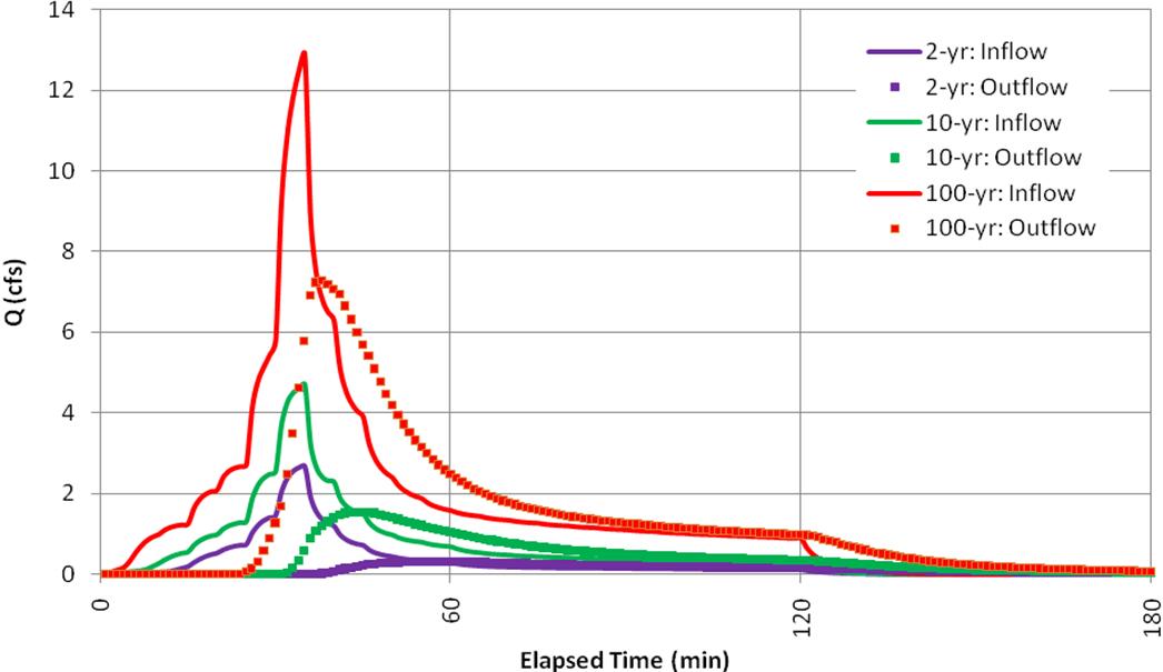In Example 3 the quantitative objective for the design of a detention pond was to reduce the post-development watershed discharge to pre-development levels. The LIDs modeled here will not be designed to accomplish a specific quantitative objective but rather to achieve a general reduction in runoff volume to help meet sustainability goals and place a lower burden on stormwater controls further downstream in the basin. The performance of the LIDs for the 2-, 10- and 100-yr storms will be analyzed.