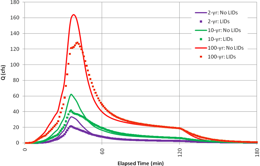 Figure 4-10 compares the discharges simulated at the outlet of the study area for each design storm (2-, 10- and 100-yr return period) both with and without LIDs. For each design storm LIDs reduce both runoff volumes and peak discharges. As the storm event becomes larger, LIDs become less effective and the attenuation of their volumes and peak-discharges is reduced. These percent reductions in outlet volumes and peaks are compared in Figure 4‑11. It shows how the benefit of LID controls decrease with increasing size of storm.