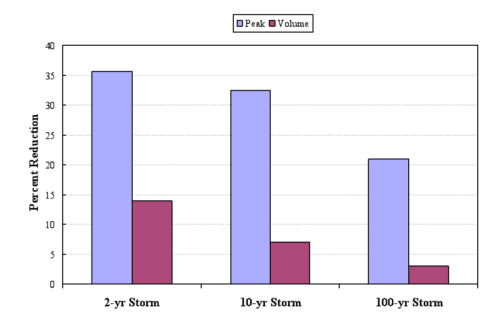 Figure 4-11. Percent reduction in outlet peak flows and runoff volumes with LIDs