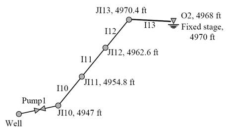 After these nodes are created, a set of force main pipes I10, I11, I12 and I13 are added between nodes JI10, JI11, JI12, JI13, and O2, respectively (refer to Figure 8‑6). The properties of these pipes are listed in Table 8‑5.