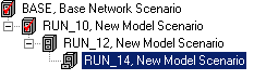 | Scenario Display Window | IDs and descriptions of the available scenarios is displayed here. In addition, the relationship between a parent scenario and its child, defined as inheritance, is displayed in this box. InfoSWMM shows this relationship in the form of a directory tree. All scenarios are children of the *BASE* scenario until some element of the child is made unique from the parent (such uniqueness comes in the form of data sets, facility sets, or option sets). In the example below, RUN_14 is a child of RUN_12, RUN_12 is a child of RUN_10, and RUN_10 is a child of BASE. When a change is made to a parent, unless some facet of a child is unique, it will inherit the change through inheritance. | |