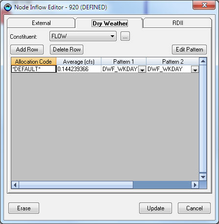 icon located at the second row of the top of the attribute browser, select Inflow from the initiated pop up menu, and then click on Dry Weather button. This will initiate the following Dry Weather Inflow editor.