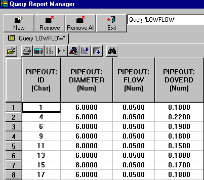 - Open the DB Query Manager under the Control Center by creating a new query called "LOWFLOW, Pipe Flow < 1.5 cfs".