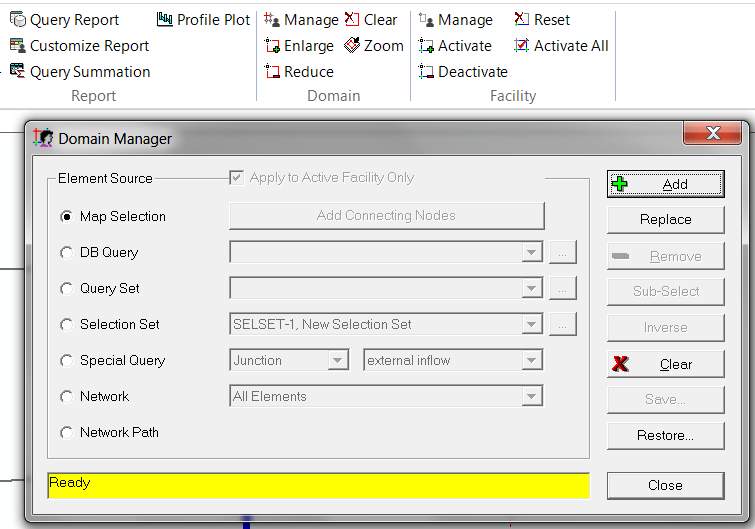 - In general, Domain Manager is used as a quick editing feature by selecting subset of network elements. In the contrary, the Facility Manager is used to select elements (e.g., subset of a drainage system) to be considered during model simulation. In other words, only the facilities selected (active facilities) are considered during simulation, and inactive (deactivated) facilities are regarded as non-existent. For more information click the following links: