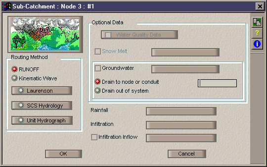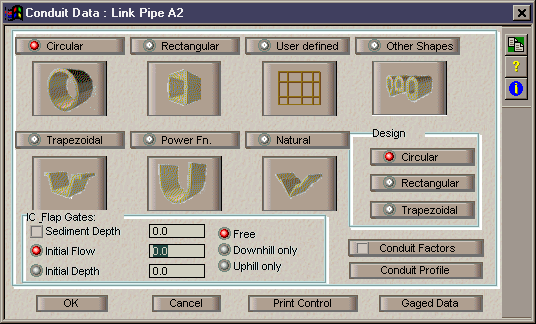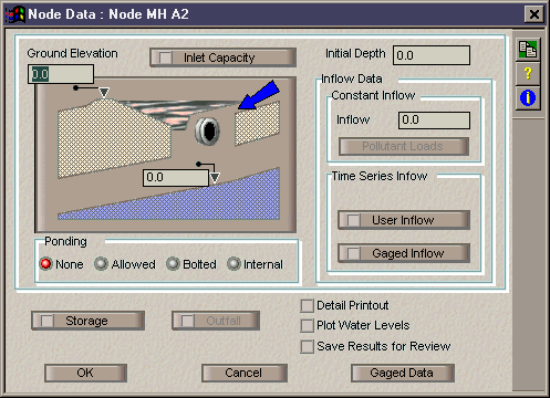 The most straightforward method of data entry in VISUAL SWMM is to enter data to the objects through dialogs. To access these dialogs double-click with the left mouse button on the object. An alternative and much more cumbersome method to access the dialogs is to select the object and then use the command Edit=>Data. These first level dialogs contain the most common data for links and nodes. Other data is entered in dialogs spawned by selecting buttons on these dialogs and some data such as rainfall is entered in a global database. Details of the global database will be dealt with later. The first dialogs of the node and link are shown below. The node dialog is layer dependent and shows different data depending on the active layer. Note that the object name is displayed in the dialog title bar.