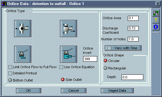 The orifice is circulat side outlet orifice at an elevation of 399 and an area of 0.1 m2.