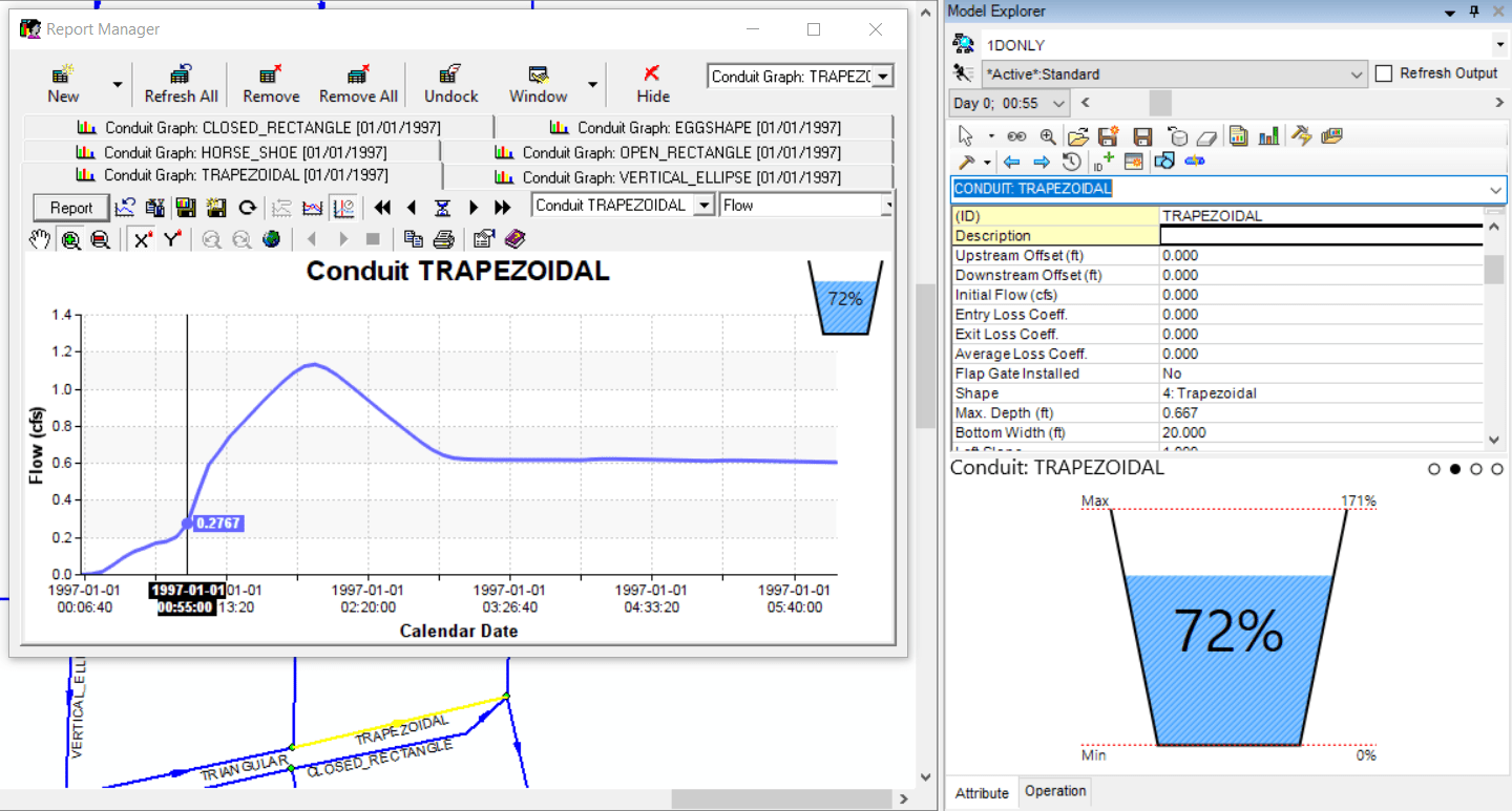 Figure 5 Linked Time Track, Animation Time Control on the Attribute Browser, 2D cross section view of the Surcharge d/D for a Trapezoidal Shaped Link.
