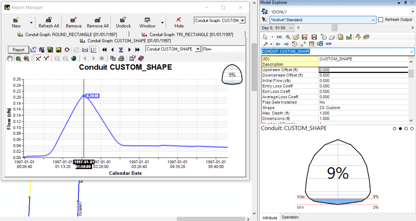Figure 24 Linked Time Track, Animation Time Control on the Attribute Browser, 2D cross section view of the Surcharge d/D for an User Defined Custom Shaped Link.