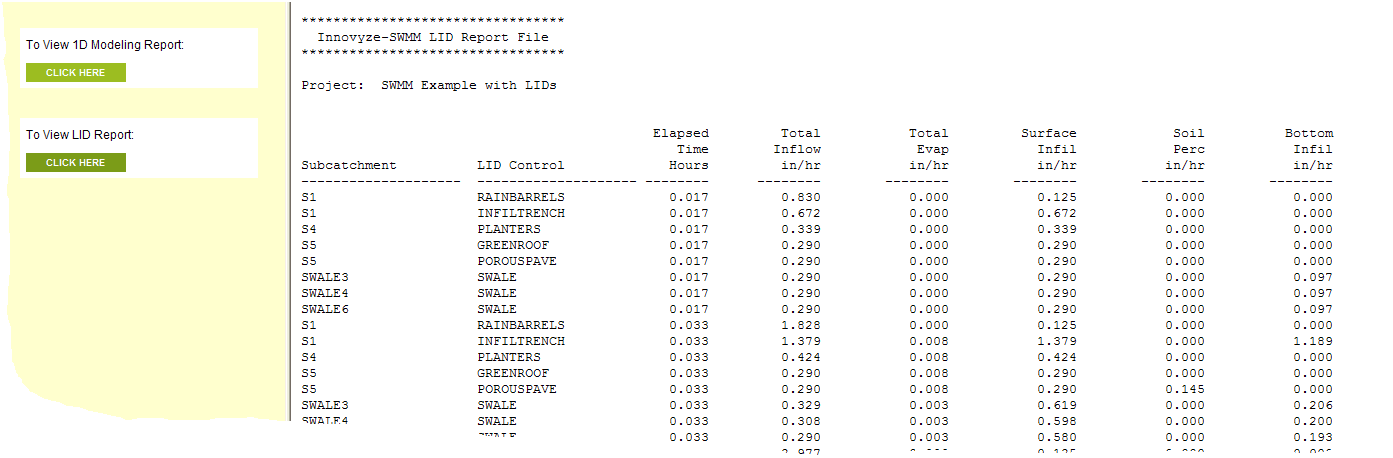 The performance of the LID controls placed in a Subcatchment is reflected in the overall runoff, infiltration, and evaporation rates computed for the Subcatchment as normally reported by SWMM5. The SWMM's Output Modeling Report also contains a section entitled LID Performance Summary that provides an overall water balance for each LID control placed in each Subcatchment. The components of this water balance include total inflow, infiltration, evaporation, surface runoff, underdrain flow and initial and final stored volumes, all expressed as inches (or mm) over the LID's area. This report is listed in the text RPT file and the Output Report Manager Table.