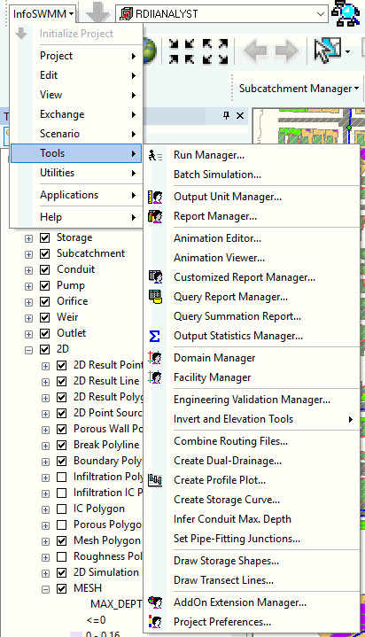 All the commands for the Tools Menu commands in InfoSWMM.