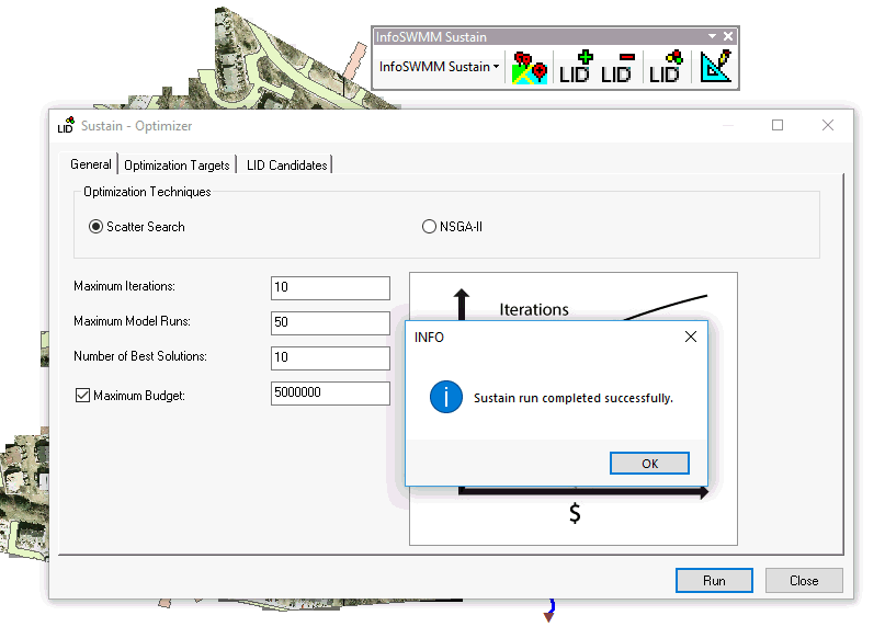 The Optimizer runs many InfoSWMM runs to optimize the selected LID Types. Click on Run and you will see a Blue progress bar at the bottom of the screen and at the end of the Run an Info Dialog Message Box.