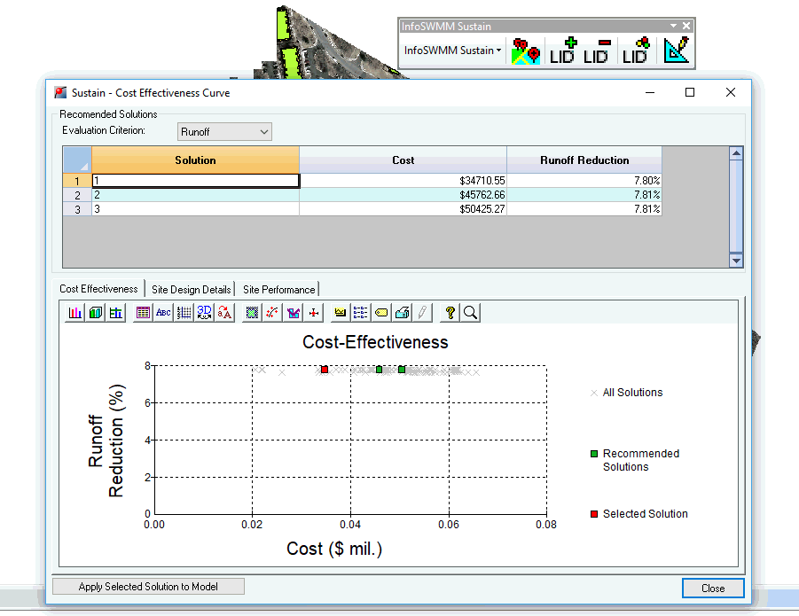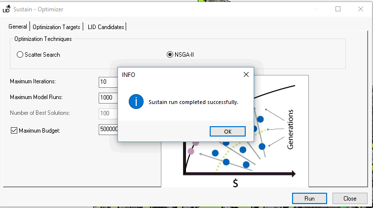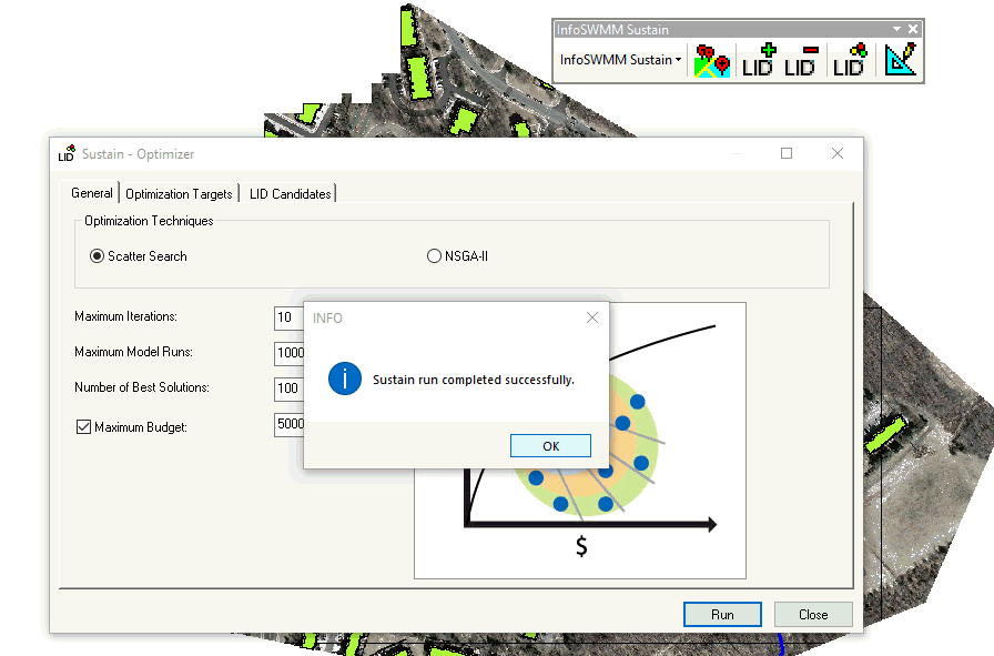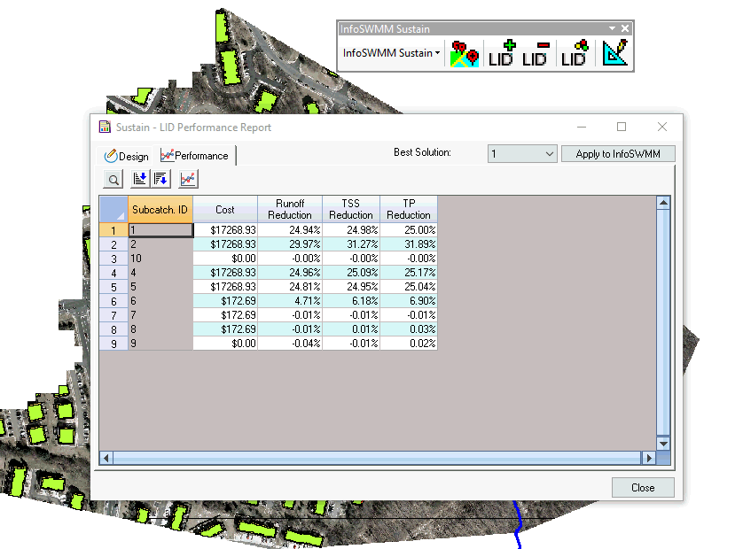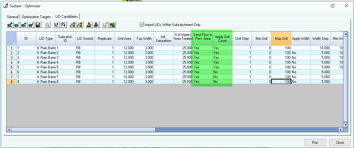 This example shows the importance of a treatment train, the percent imperious draining to the LID's on a Subcatchment, the importance of optimizing for the number of units, area and soil thickness. Sustain will optimize the number of Rain Barrels on the ten Subcatchments.