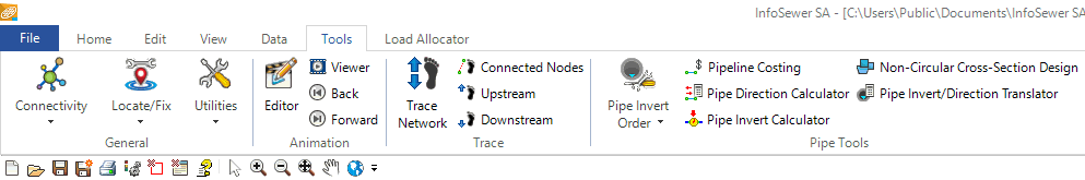 The InfoSewer SA Home Tab is a collection of shortcut buttons to access commonly-used InfoSewer SA commands.